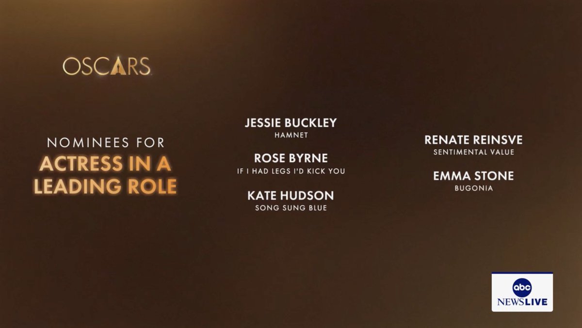 Happy International Women's Day! Yesterday, I asked "Actresses and other female-dominated categories at the Oscars, anyone?" I didn't see any comments to the contrary, so that's what I'm covering for the Sunday entertainment feature today as filtered through Gold Derby's odds. Jessie Buckley leads Best Actress in a Leading Role for her role as the original Anne Hathaway in Hamnet with every editor and expert plus 96.3% of users. Rose Byrne sits in second with the support of 2.5% of users. She's followed by Renate Reinsve at 0.6%, Emma Stone at 0.5%, and Kate Hudson at 0.1%. I voted for Stone at the Saturn Awards and hope she wins tonight; she's not winning here.