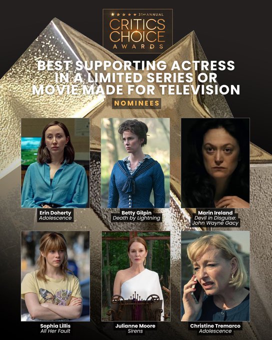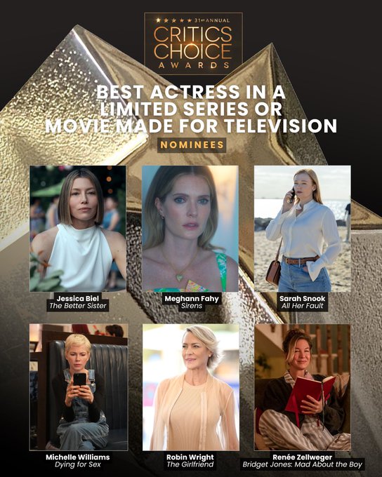 Other limited series earning acting nominations are Sirens with two nominations for its actresses and Monster: The Ed Gein Story, The Beast in Me, and The Better Sister with one nomination each for their actors and actresses. They're competing against one actor and one actress from movies made for television, which I'm featuring next.