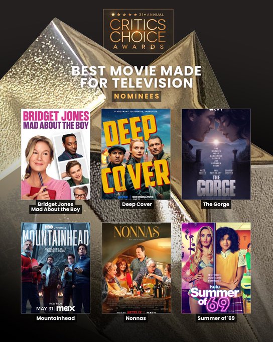BEST MOVIE MADE FOR TELEVISIONTwo movies, Bridget Jones: Mad About the Boy and Mountainhead, have a second nomination for acting. The rest have only this one program nomination. Gold Derby breaks the tie in favor of Bridget Jones: Mad About the Boy, the choice of every expert, 80.0% of editors, and 83.5% of users. Mountainhead sits second in the odds as the pick of the rest of the editors plus 8.3% of users. Nonnas is third with 3.8% user support, followed by The Gorge with 2.6%, Summer of '69 with 1.0%, and Deep Cover with 0.8%. At least Deep Cover can take solace in being a potential leader for next year's Emmys, since most of the rest of the field was already nominated at this year's Emmy Awards and Summer of '69 came out in May, so none of them are eligible.