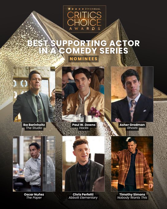 BEST SUPPORTING ACTOR IN A COMEDY SERIESEmmy winner Jeff Hiller from Somebody Somewhere was ineligible, so another actor will win here. Gold Derby thinks it will be Ike Barinholtz, which was one of their top choices to win Outstanding Supporting Actor at the Emmys, with every editor and experts along with 90.1% of users picking him to win. Second time's the charm! The rest of the field has single-digit user support, Paul W. Downs at 3.9%, Chris Perfetti at 2.1%, Oscar Nuñez and Asher Grodman tied at 1.4%, and Timothy Simons at 1.2%.