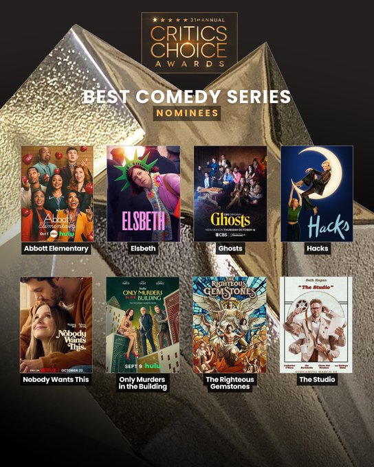 BEST COMEDY SERIESNobody Wants This leads Best Comedy Series with five nominations, followed by Ghosts and Hacks with four, Abbott Elementary, The Righteous Gemstones, and The Studio with three, Elsbeth with two, and Only Murders in the Building with just this one. Based on The Studio winning a total of thirteen Emmy Awards, including Outstanding Comedy Series, the Gold Derby odds should favor The Studio and they do. Every editor and expert plus 92.2% of the users selected The Studio to win. It's followed by Hacks with 3.1% user support, Abbott Elementary with 1.7%, Only Murders in the Building with 1.1%, and the rest with less than one percent.
