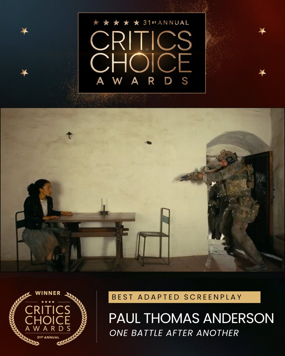 One Battle After Another still leads as the choice of every editor, 81.3% of experts, and 90.9% of users. The experts and users are moving in opposite directions. The remaining experts are now split between Hamnet and Train Dreams with 12.5% and 6.3% expert expectations of winning, respectively. Hamnet is now the pick of 6.5% of users, followed by No Other Choice, Frankenstein, Bugonia, and Train Dreams follow with 1.0%, 0.9%, 0.4%, and 0.3% of users supporting each, respectively.The field is the same except for No Other Choice dropping out because of the field being trimmed from six to five.* Gold Derby thinks the results will be the same, too, with One Battle After Another winning. Since Critics Choice didn't upload the acceptance speech to its YouTube channel, I'm sharing the graphic from its Twitter/X account instead.