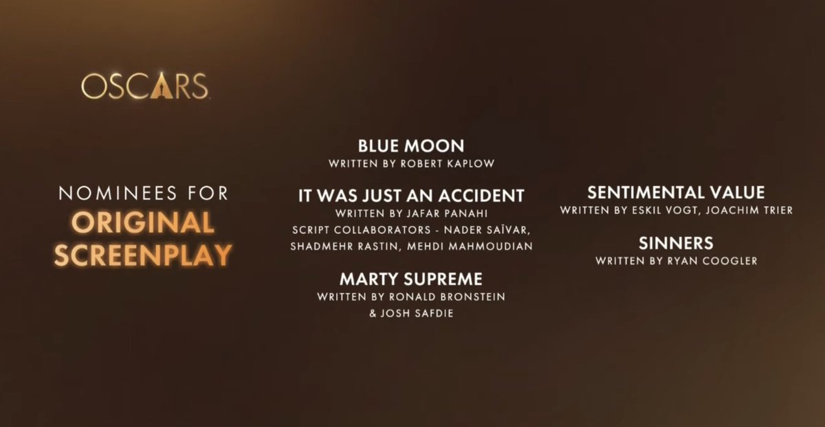 I already celebrated Ryan Coogler's win for Best Original Screenplay at the Critics Choice Awards in 'Sinners' wins at the Critics Choice Awards and Golden Globes for MLK Day weekend, so I'm moving on to Gold Derby's odds for Best Original Screenplay at the Oscars, which have Coogler leading for Sinners with the first place votes of 90.9% of experts, every editor, and 88.9% of users. The users and experts split on second place between Sentimental Value with 5.6% of users choosing it and Marty Supreme with the support of the remaining 9.1% of experts and 3.0% of users. It Was Just an Accident and Blue Moon follow as the choices of 2.0% and 0.9% of users, respectively. This is a great showing for Foreign-Language Films!